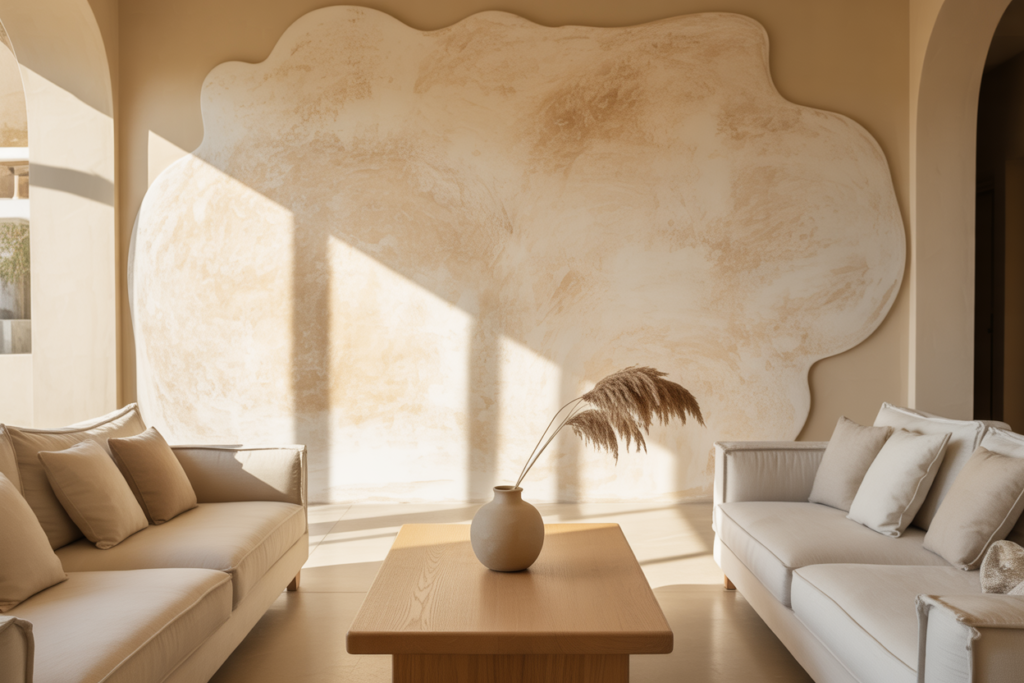 Textured plaster walls add subtle depth and organic beauty to living room spaces. Soft neutral tones create a calming and sophisticated environment.