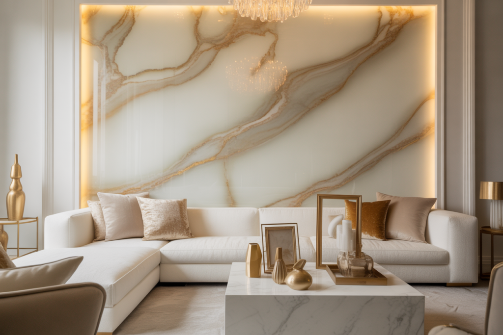 Marble accent walls add a luxurious and timeless touch to any living room. White marble with gray veining creates an elegant focal point that pairs perfectly with modern furniture.
