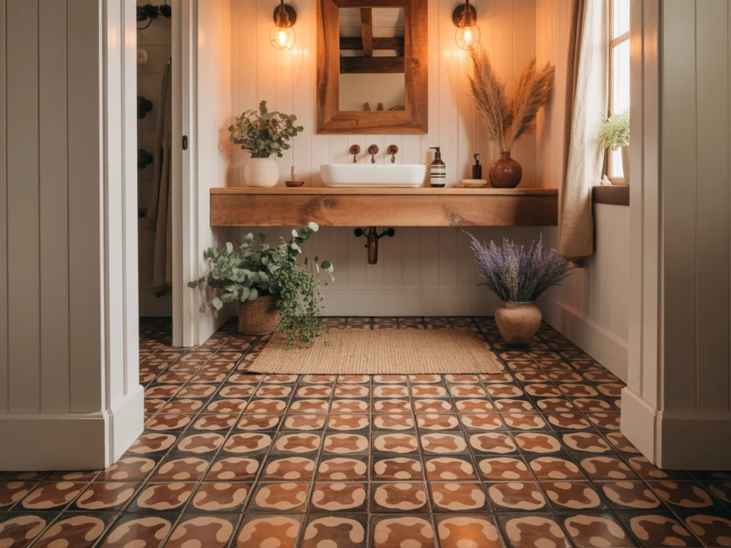 This bathroom floor tile ideas boho and farmhouse crossover style works beautifully when paired with white shiplap walls, warm wood vanity cabinetry, oil-rubbed bronze or unlacquered brass fixtures, and natural textile accents like jute rugs and linen towels. Encaustic cement tiles are also increasingly available at accessible price points through bathroom floor tile ideas home depot and major tile retailers, making the Joanna Gaines farmhouse bathroom floor look achievable for a wide range of renovation budgets.