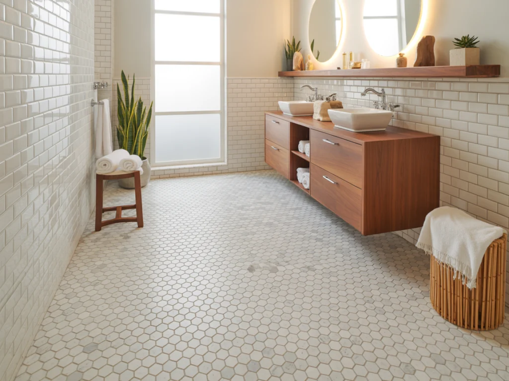 White Carrara marble hexagon tile is also one of the most widely available and accessible bathroom floor tile ideas, home depot and tile specialty store staples, making it an achievable option at almost any renovation budget. This bathroom floor tile ideas white choice works harmoniously with virtually every wall tile, cabinet color, and fixture finish, which is precisely why interior designers have relied on it as their go-to bathroom floor solution for generations.