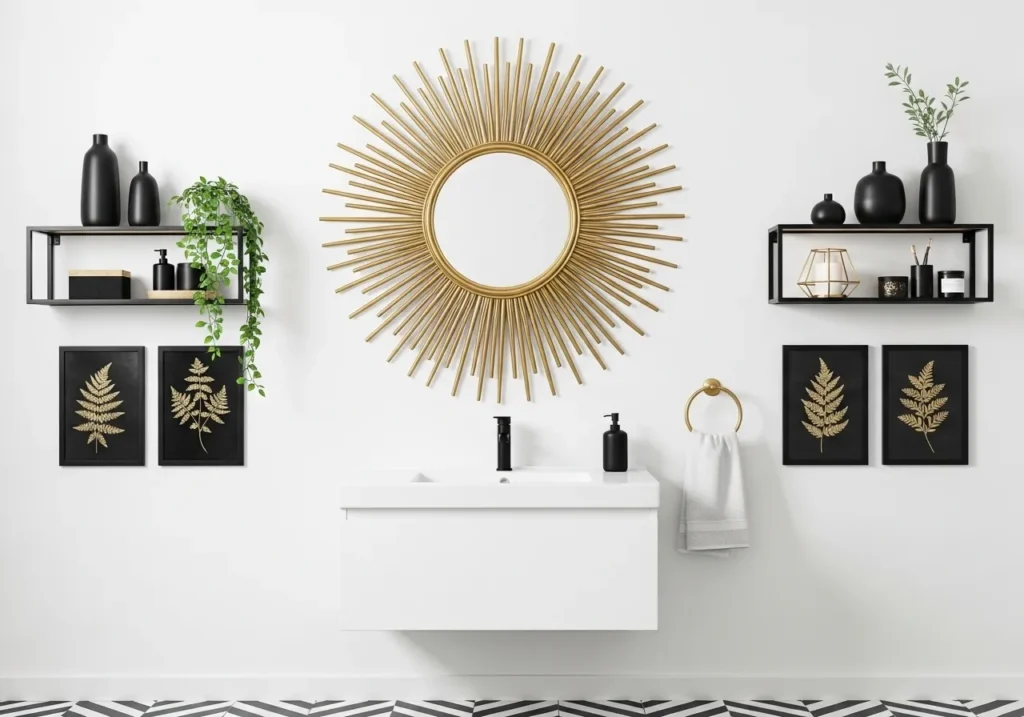 A large gold sunburst mirror is the single most impactful black white and gold bathroom wall decor investment available because its radiating sculptural form commands the entire vanity wall with a boldness and warmth that no rectangular framed mirror can approach. The sunburst silhouette works particularly well in the black white and gold bathroom aesthetic because its circular center surrounded by radiating gold rays simultaneously references Art Deco geometry, mid-century modern design, and contemporary maximalist styling — giving it a timeless quality that transcends any single decorating era.