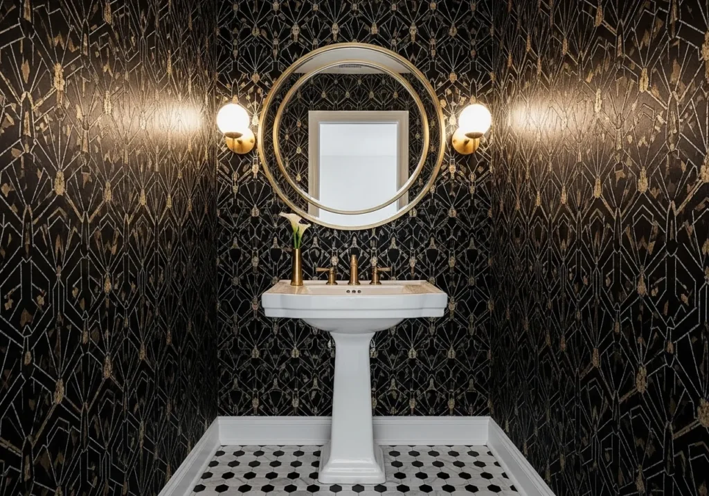 A black and gold Art Deco geometric wallpaper is the most dramatically transformative single element available in black white and gold bathroom wallpaper design because it converts a plain bathroom from a purely functional space into an immersive, jewel-box environment of extraordinary visual richness in a matter of hours. The metallic gold foil details in a quality Art Deco wallpaper interact with bathroom lighting in a dynamic and magical way — catching warm sconce and ceiling light from different angles as you move through the room and creating a constantly shifting sparkle that makes the small bathroom feel alive and cinematic.