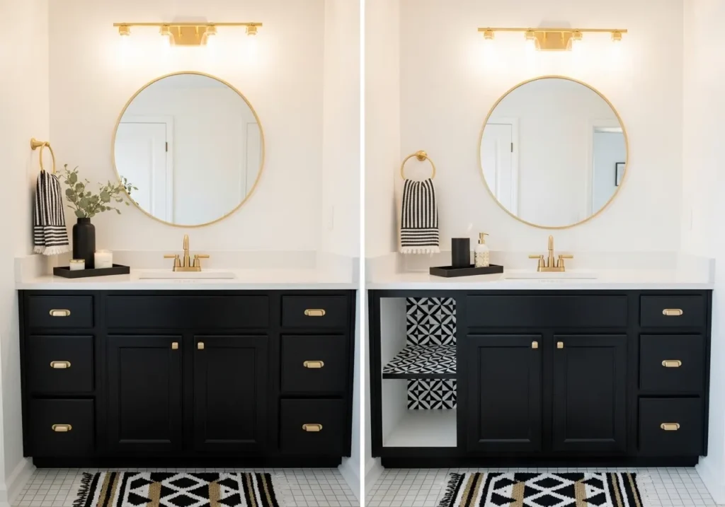 A black white and gold bathroom DIY transformation is one of the most achievable and satisfying bathroom upgrade projects available because the three-color palette provides a clear, decisive design direction that guides every purchasing and painting decision with absolute clarity. Painting the existing vanity cabinet in matte black is the highest-impact single DIY move in this transformation — it instantly modernizes, darkens, and grounds the bathroom while providing the perfect dark foundation for brushed gold hardware to shine against.