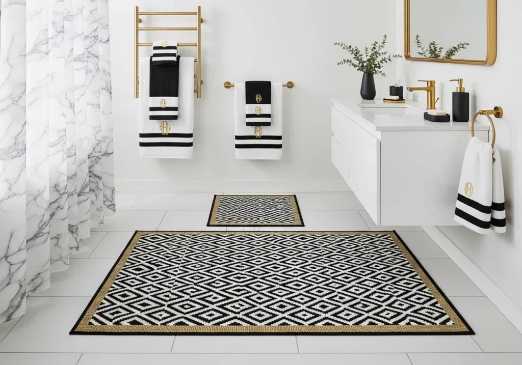 Black white and gold bathroom rugs and textiles are the most accessible and immediately effective decorating tools in the entire black white and gold bathroom decor toolkit because they introduce the color palette at floor level and surface level simultaneously, creating warmth, pattern, and visual continuity across every horizontal surface in the room.