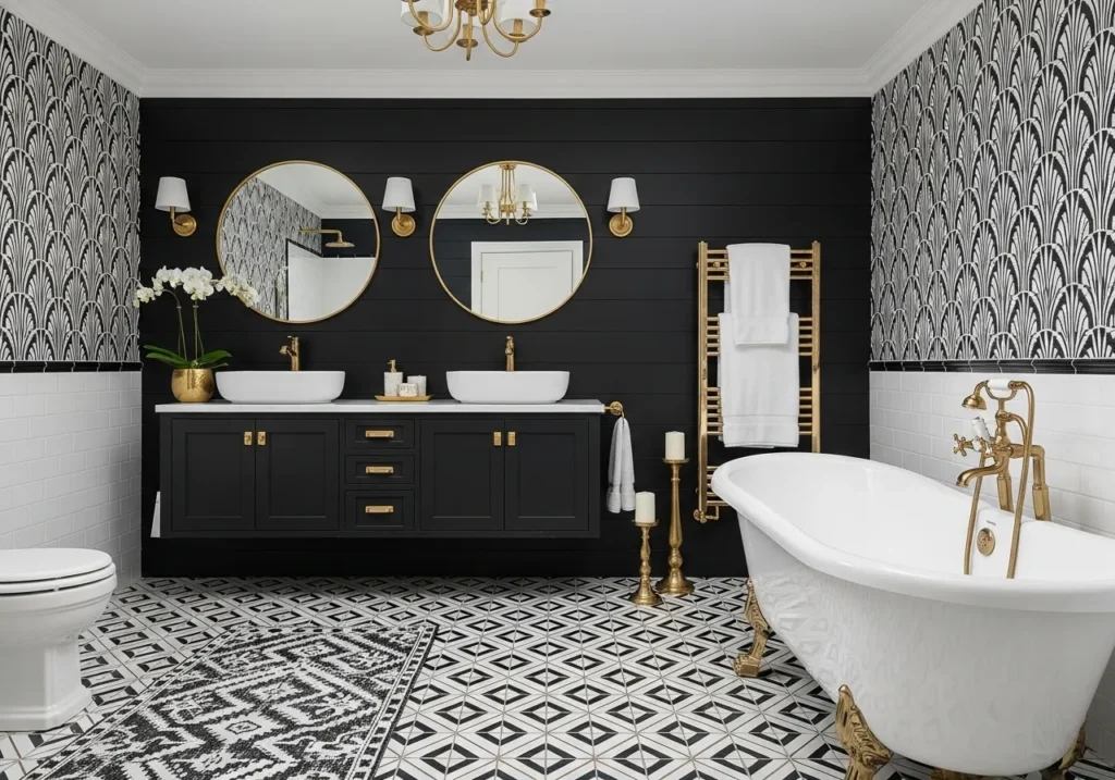A fully realized black white and gold bathroom aesthetic brings all the individual design moves of the palette together into one comprehensive room that demonstrates the extraordinary power of absolute commitment to a single resolved color story. The combination of black shiplap walls, white freestanding clawfoot tub, gold claw feet and fixtures, encaustic tile floor with gold grout, double black vanity with gold mirrors and sconces, and Art Deco wallpaper accent wall creates a room of layered, multidimensional visual richness where every surface contributes to the overarching black white and gold bathroom design story.