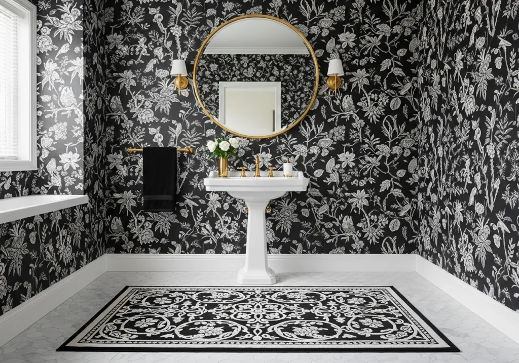 A black chinoiserie botanical wallpaper combined with a black white and gold medallion bath rug is the most decoratively ambitious and visually extraordinary expression of the black white and gold bathroom aesthetic, creating a bathroom that functions simultaneously as a private sitting room, a personal art gallery, and a five-star hotel powder room. The chinoiserie pattern — with its intricate white botanical illustrations and gold metallic bird and leaf details on a deep black ground — brings the black white and gold palette to life in the most culturally rich and historically resonant way possible, referencing the centuries-long European fascination with East Asian decorative arts that produced some of the most beloved and enduring pattern designs in the history of interior decoration.