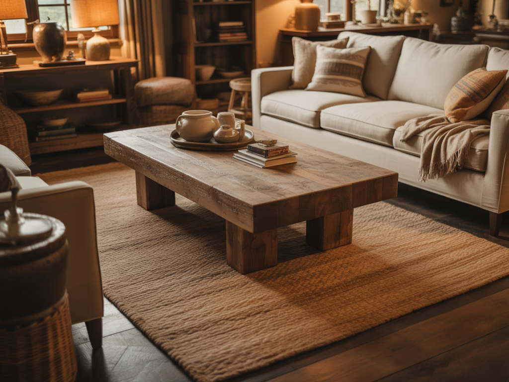 Rustic wood coffee tables bring warmth and organic texture to interiors. Natural grain, distressed finishes, and chunky silhouettes create a welcoming environment that feels relaxed and grounded.