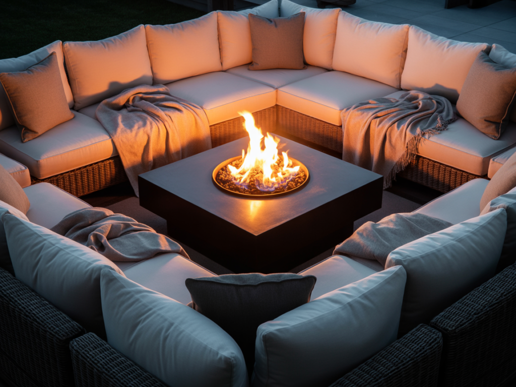An outdoor sectional sofa around the fire pit creates the ultimate relaxation zone that feels like an extension of your living room. Plush cushions and layered textures make the area perfect for long cozy evenings with family or friends.