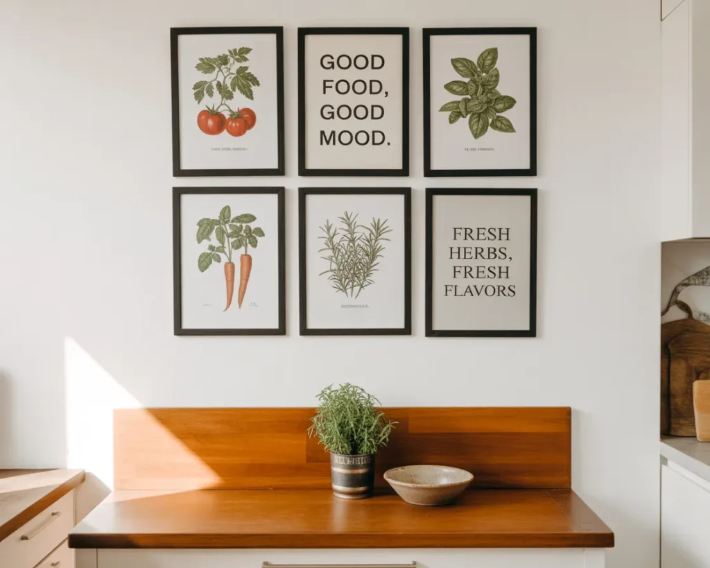 If you want something more creative, a gallery wall is perfect. Mix different frame sizes and display cooking quotes, food illustrations, herbs, or vintage recipe cards.