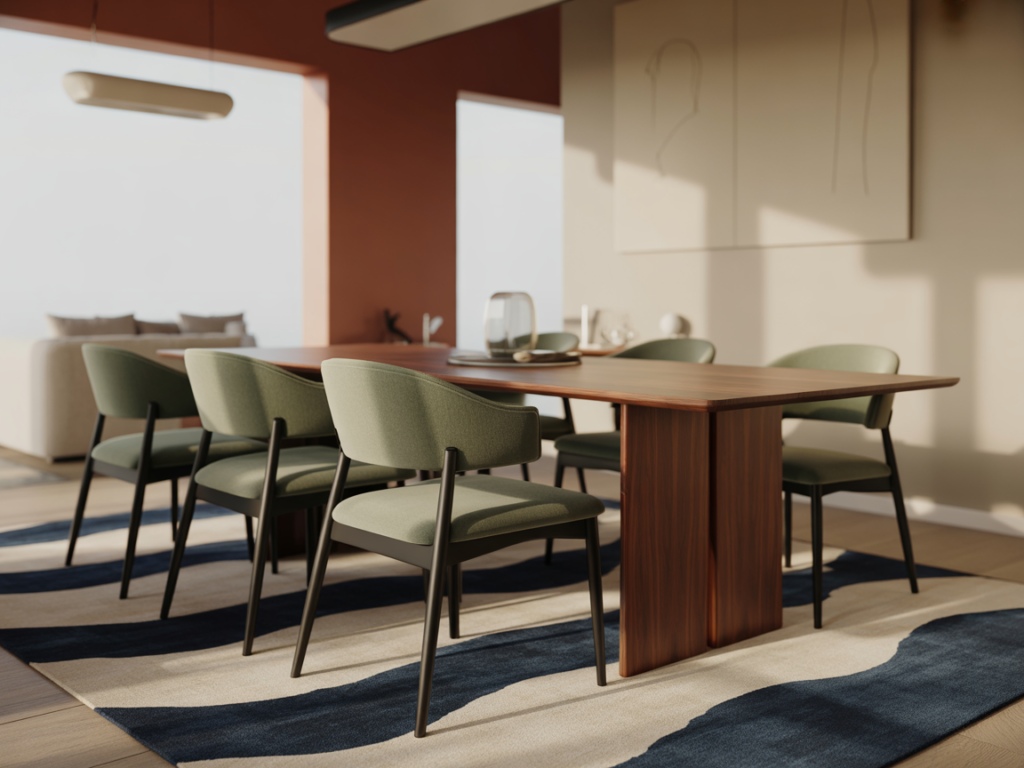 Pairing a mid-century wood dining table with upholstered chairs on a geometric rug can add character and warmth. The rug helps define the dining space while maintaining the open, airy feel.