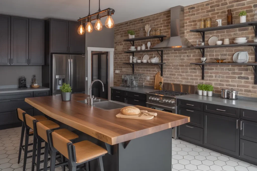 Black cabinetry creates a sleek industrial backdrop in this design. The dark cabinets allow architectural elements like brick walls and open shelving to stand out.