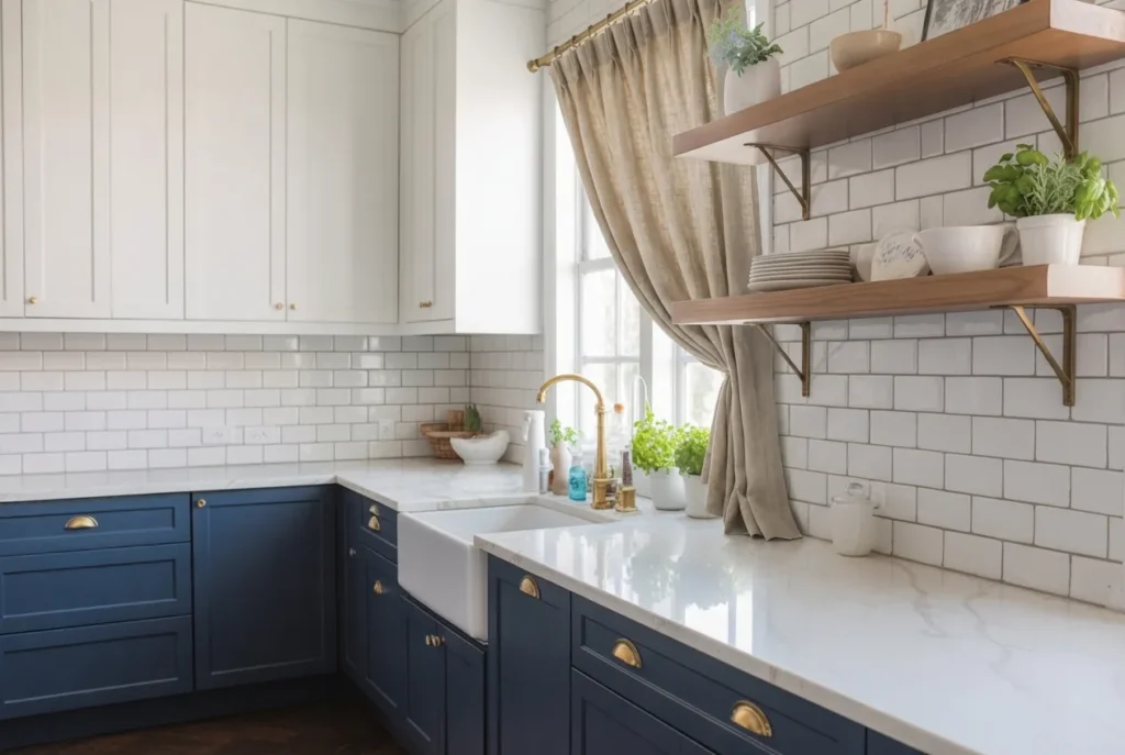 A navy island adds contrast and acts as a visual centerpiece. This simple strategy gives personality to compact kitchens without making them feel crowded.