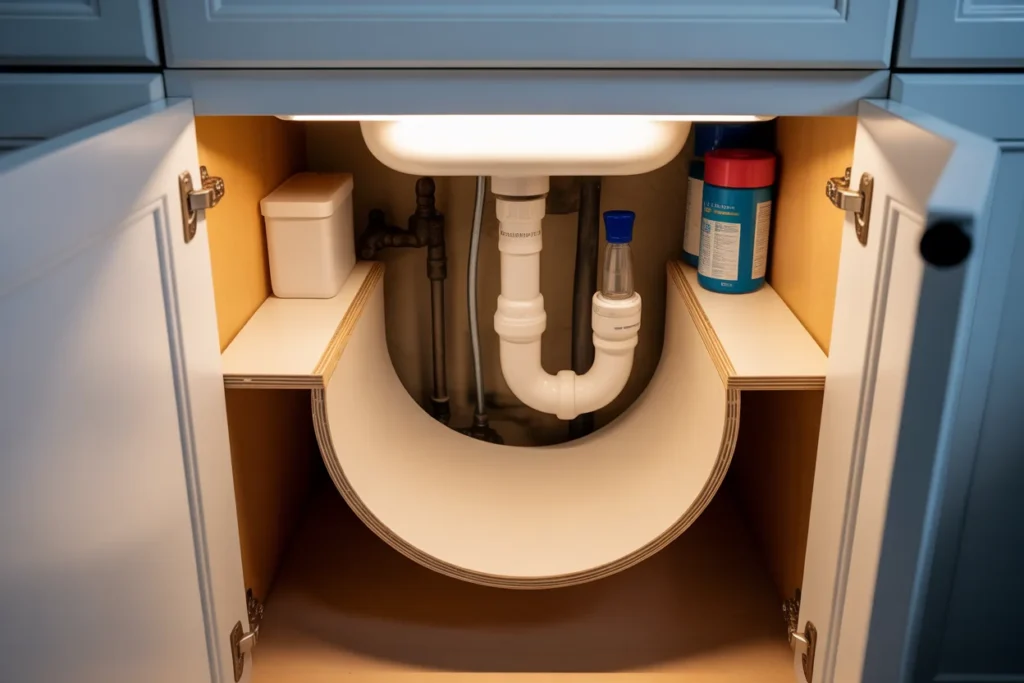 A DIY curved shelf built around plumbing pipes is the most space-efficient under-sink storage solution for awkward cabinet layouts. It uses the space pipes normally block and turns dead zones into usable storage.