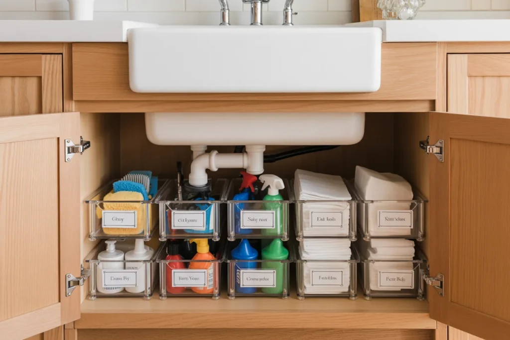 Assign one bin to dish supplies, one to surface cleaners, and one to extra supplies like trash bags and gloves. Labeling each bin turns a messy cabinet into a functional cleaning station. This approach is ideal for under kitchen sink organization because it works with pipes — just arrange bins around them and stack where the vertical space is clear.